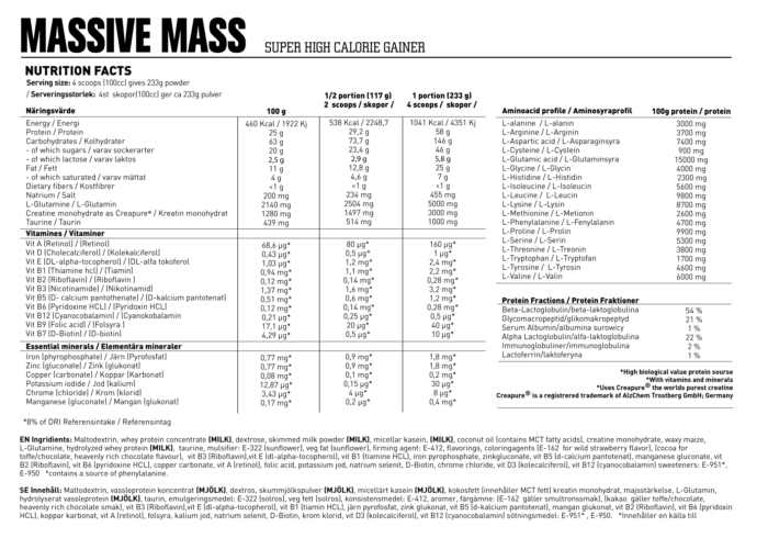 Massive Mass is an extremely well-composed Gainer for the athlete looking for a complete recovery formula with a focus on qualitative gain in weight and muscle mass.